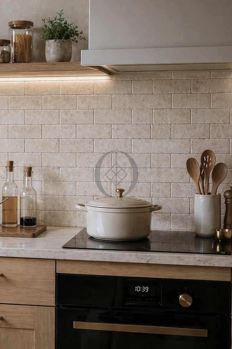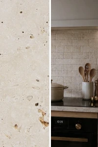 Kamień dekoracyjny Trawertyn Light bębnowany 7,5x15x1 cm to naturalna, jasna płytka o rustykalnym wykończeniu, idealna na ściany, kominki i łazienki w stylu nowoczesnym lub klasycznym.