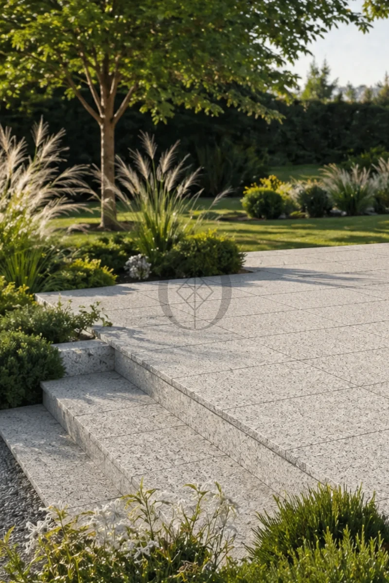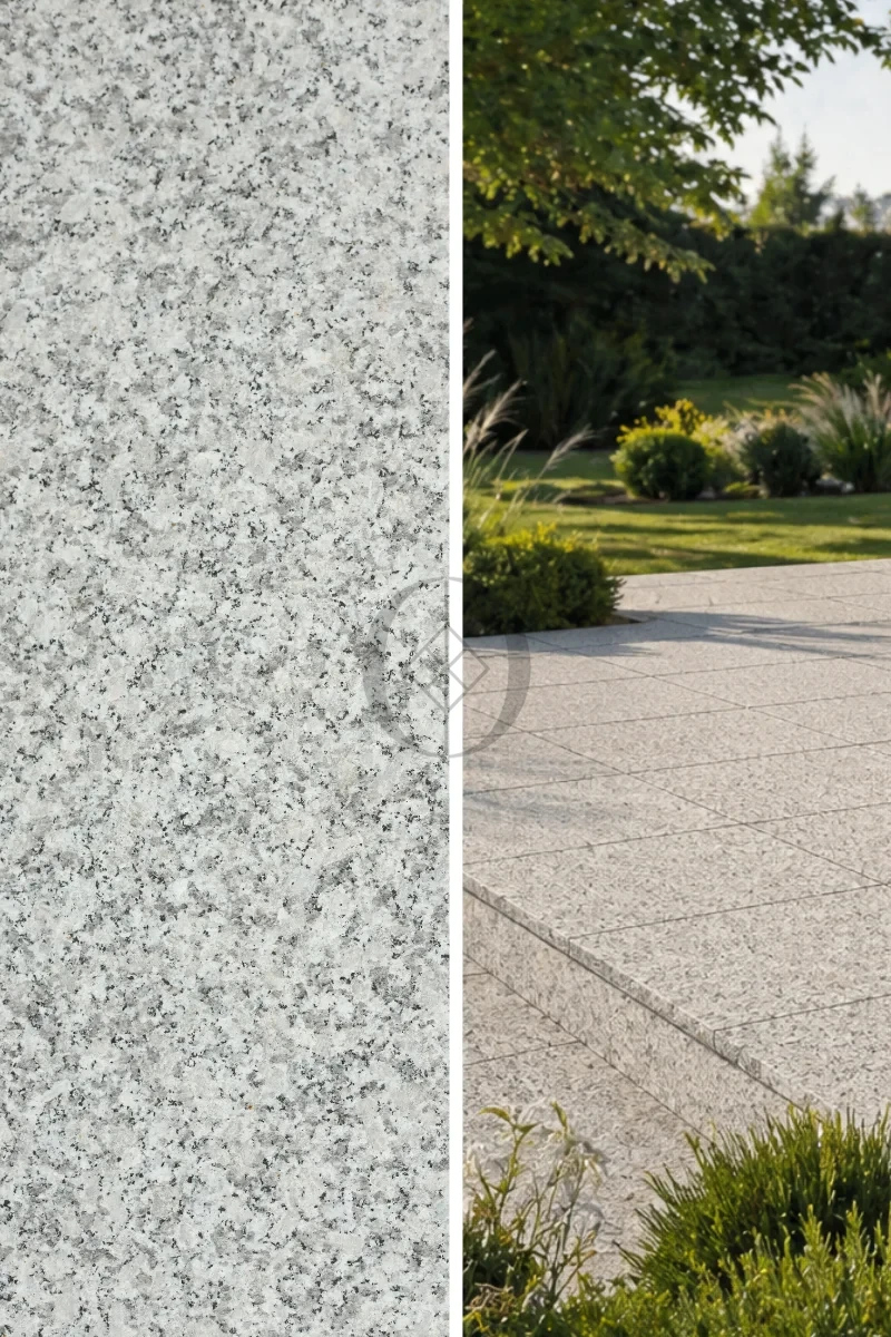 Płytka granitowa G602 Bianco Sardo 40x40x4 cm – gruba, płomieniowana płyta z kamienia naturalnego o antypoślizgowej powierzchni, idealna na tarasy, podjazdy i schody zewnętrzne.