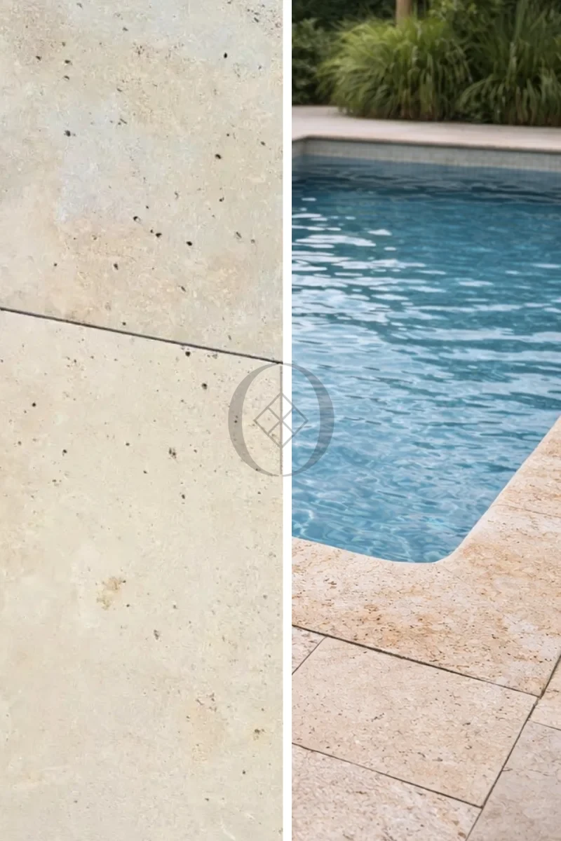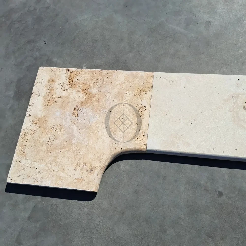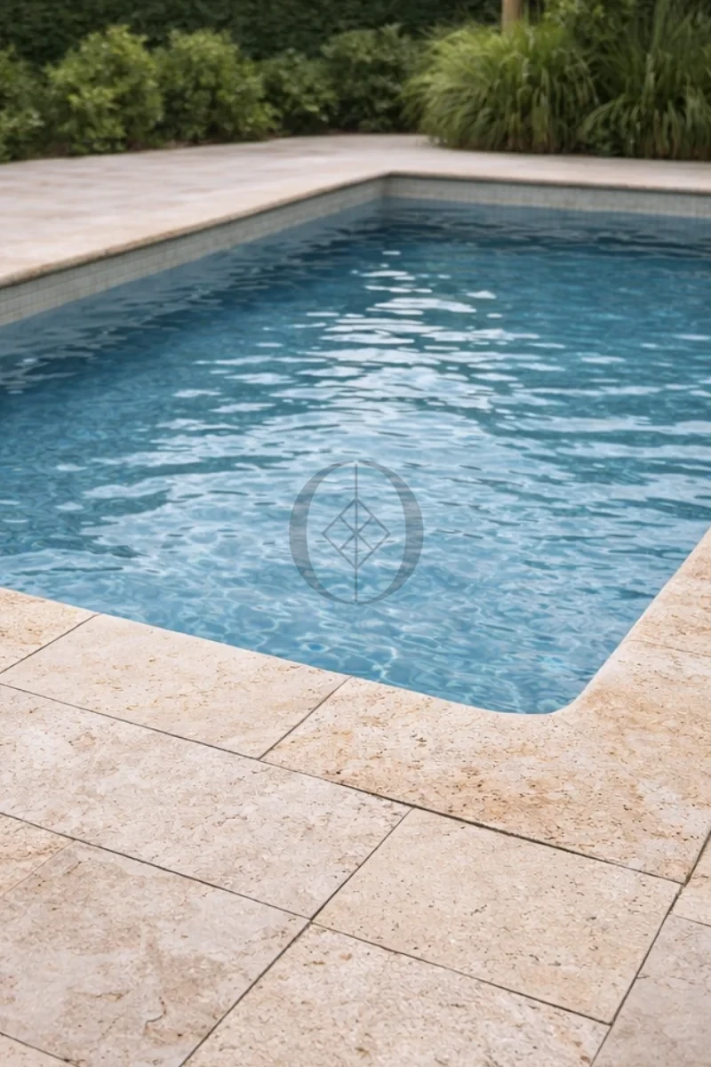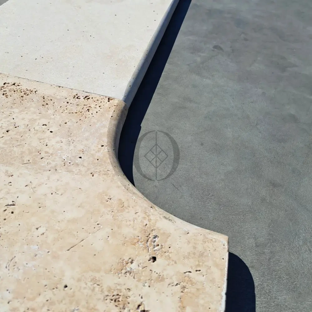 Trawertyn Classic Mix Kamień Brzegowy Narożny 3 cm 40,6×61 cm | Obrzeża do basenu Bullnose to masywny element wykończeniowy z naturalnego trawertynu przeznaczony do narożników niecki basenowej. Grubość 3 cm zapewnia wysoką stabilność i odporność na warunki atmosferyczne, a profil bullnose (zaokrąglona krawędź) zwiększa bezpieczeństwo w strefie mokrej.