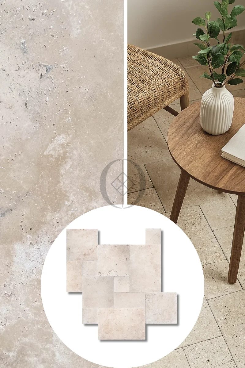 Naturalny trawertyn Ivory Classic Mix – komplet rzymski 0,742 m² z bębnowanym wykończeniem do podłóg i tarasów.