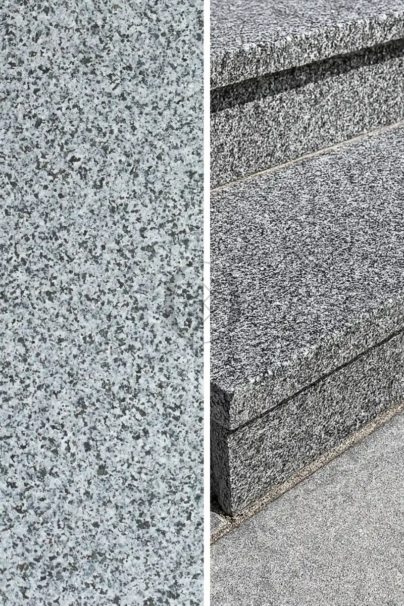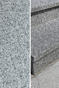 Stopnica granitowa Dark Grey New G654 – płomieniowana powierzchnia w odcieniu grafitu do schodów zewnętrznych i wewnętrznych.