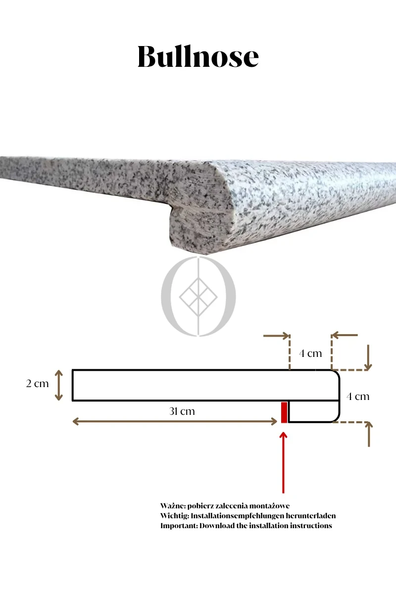 - Stopień 120x35x2 cm – powierzchnia płomieniowana o zwiększonej antypoślizgowości, krawędź bullnose (zaokrąglona) poprawiająca bezpieczeństwo i komfort użytkowania