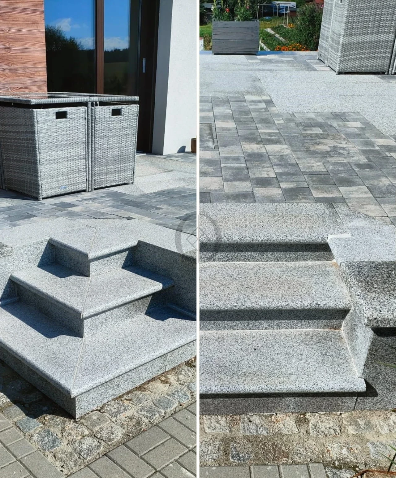 Elementy z tej samej odmiany granitu umożliwiają wykonanie kompletnych schodów wraz z podestem i wykończeniem bocznym przy zachowaniu jednolitego wyglądu kamienia.