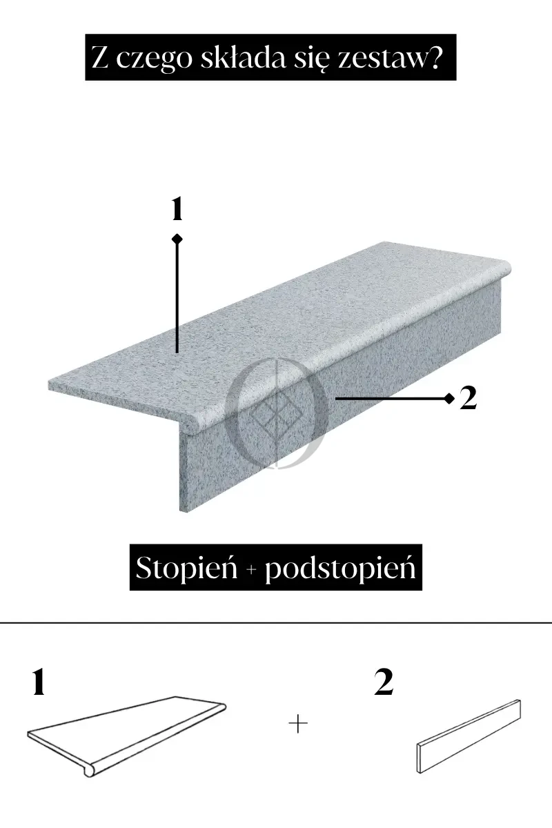 Do zestawu schodowego dostępne są dodatkowe elementy wykonane z tego samego granitu G603, co pozwala zachować spójność kolorystyczną całej realizacji. Oferujemy komponenty dopasowane tonalnie, bez wykonywania indywidualnych wymiarów.