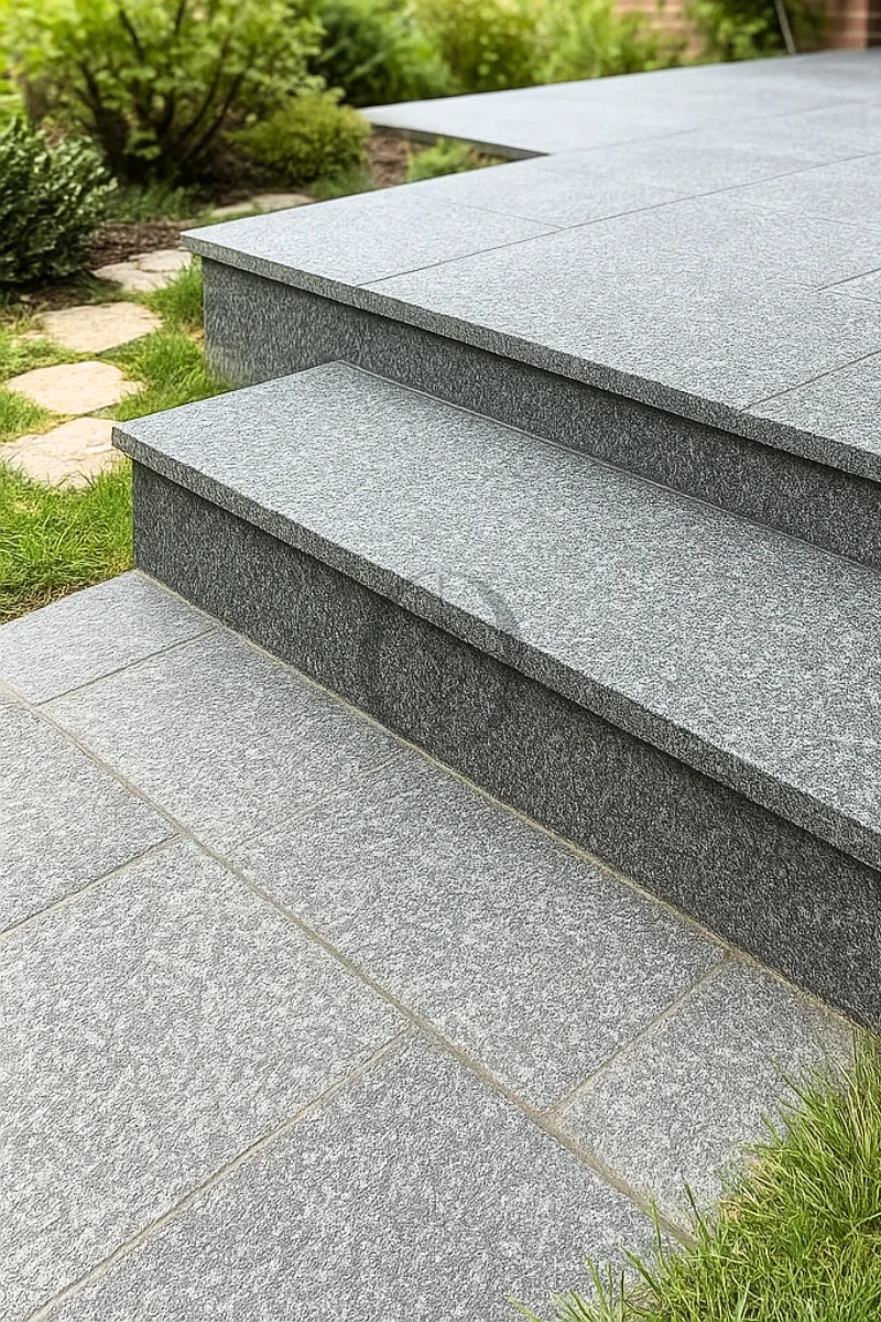 Stopnica granitowa G654 Dark Grey New z powierzchnią płomieniowaną – idealna na zewnętrzne schody i tarasy.